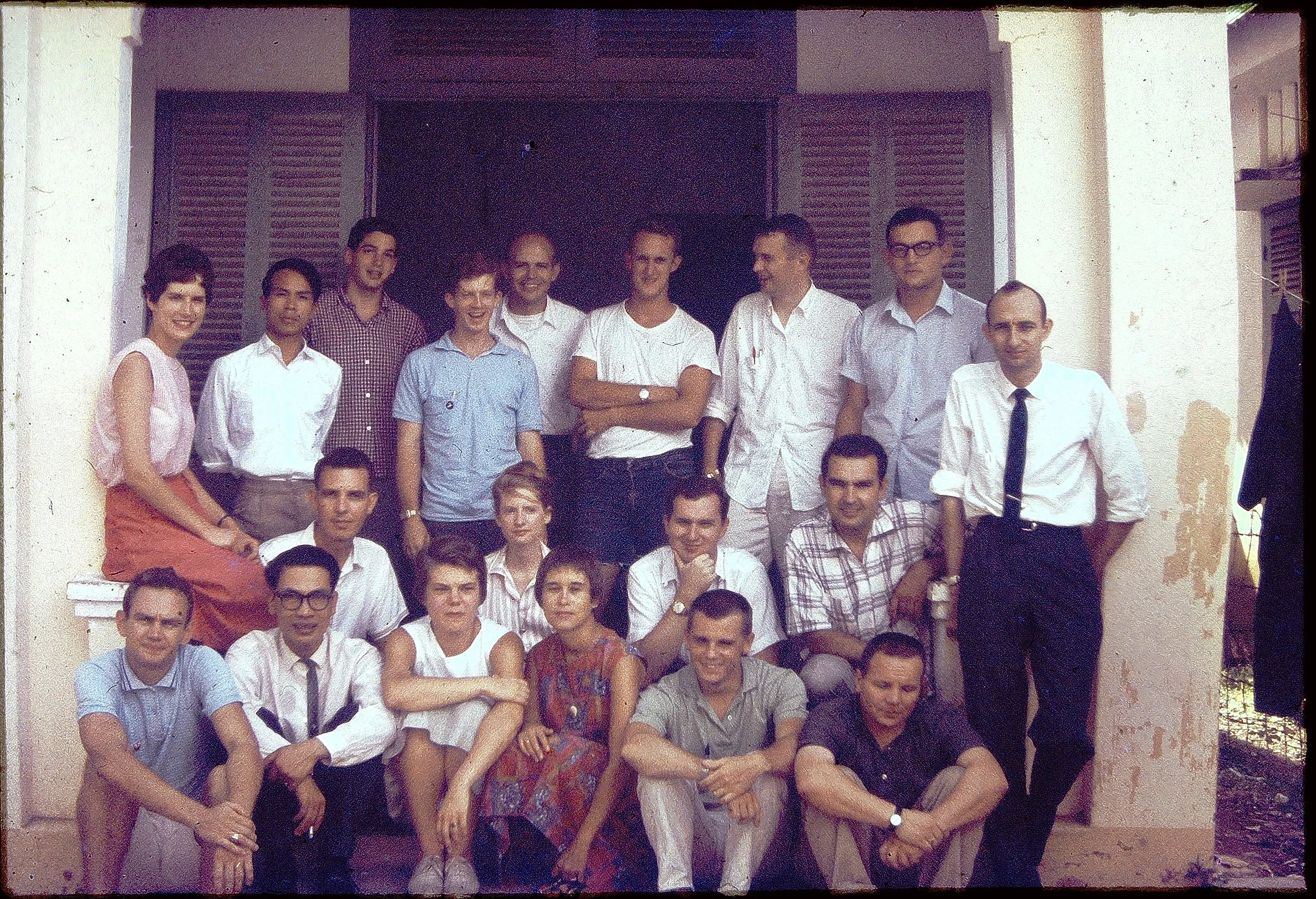 Members of the International Voluntary Services team in Vietnam, circa 1963. Pete is standing in the center, wearing a T-shirt and cutoff jeans. Photo courtesy of Carl Stockton.